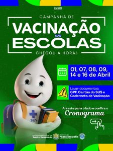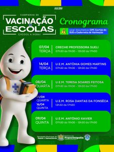 A Prefeitura de Francinópolis, por meio da Secretaria Municipal de Saúde e Saneamento, promoverá uma campanha de vacinação nas escolas da rede municipal, com o objetivo de ampliar a cobertura vacinal entre crianças e adolescentes.